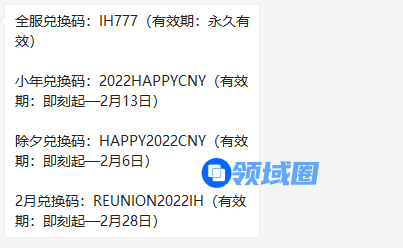 1、兑换码2022年2月:REUNION2022IH、IH777、2022HAPPYCNY、HAPPY2022CNY,随时失效,请尽快兑换,若兑换失败则表明兑换码已经失效,从而无法兑换了哦。