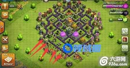 那么阵型的防守能力还是不错的,如果要进攻的话,从我图中标记的地方进攻最最佳的,用3个炸弹人炸开城墙会更加的好哦,那么最重要的是主力绝对不能走偏了,所以大家要注意清边,只要进入内部,就可以抢到资源啦。
