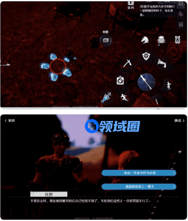 二、捡起杜恩身前石堆中央的石头,与其对话(两种选择均可,对任务流程和结局无影响)。