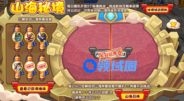 3、活动攻略:本周最难活动,点击开启秘境挑战,进入秘境与BOSS战斗,胜利即可获得祥云印记并有概率获得魂珠,十个祥云印记可开启一次山海召唤
