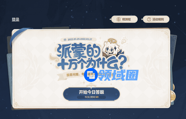 2.玩家们将上述网址粘贴到浏览器中打开即可进入到活动答题页面,玩家也可直接点击下方跳转按钮进入活动页面:点我跳转:派蒙的十万个为什么