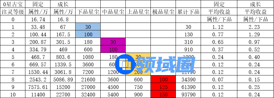 等橙色紫色按照优先级培养完了再考虑蓝色古宝,毕竟消耗一样的资源来获取极地的属性显然是不划算的,下面是同类别古宝注灵的平均收益!