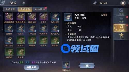 2、在没有高品级内功的情况下,玩家可选择《无念心经》增加普通攻击伤害,并有几率造成减速效果;《四照神功》在被攻击时,有几率造成减速;《干元罡气》,受到伤害时,有几率对敌人造成致盲;《浑天真气》附带3%的概率免疫控制;《拈花指》造成伤害时,有几率提升10%命中率;以上五种进行代替。