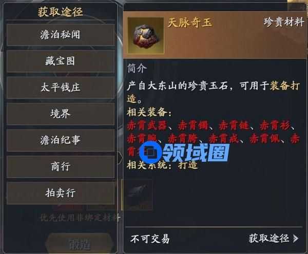 天脉奇玉是打造红装的通用材料,所有赤霄装备都需要使用。产出途经也会较多,包括周本澹泊秘闻、天字藏宝图、太平钱庄、提升境界、澹泊纪事、商行、拍卖行等。