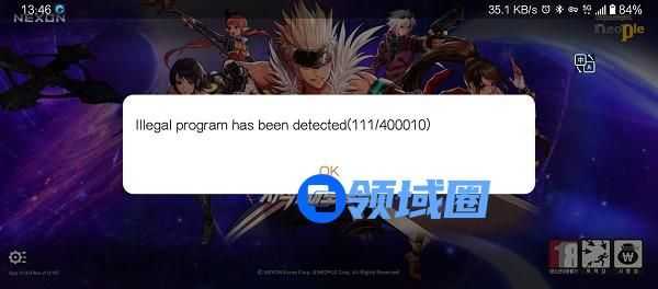 7、翻译:检测到非法程序,你目前或最近使用的加速器被列入了屏蔽名单,需要卸载他们。或者尝试关闭应用“던전앤파이터 모바일”获取应用列表权限。