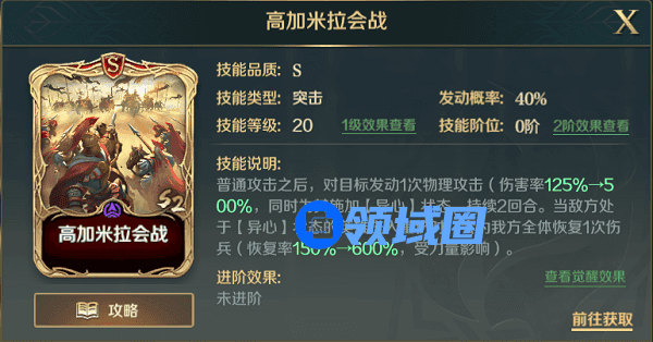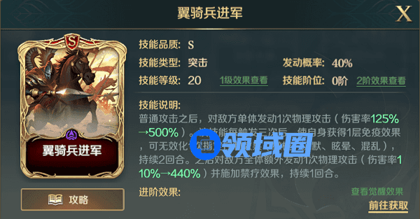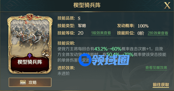 该技能可以为主将增加力量,同时为单目标伤害技能,可以能更好的触发楔型骑兵阵的集火敌方兵力最低目标的效果。
