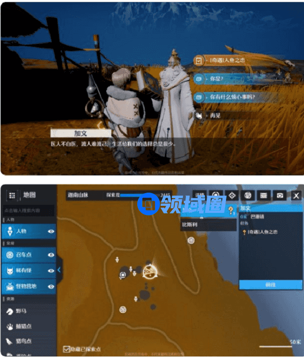 四、跟胡妮对完话前往巴珊镇找到NPC:加文,与其对话。与加文对完话继续跟加文旁边NPC:比斯利对话,并跟随比斯利前往他说的地方。