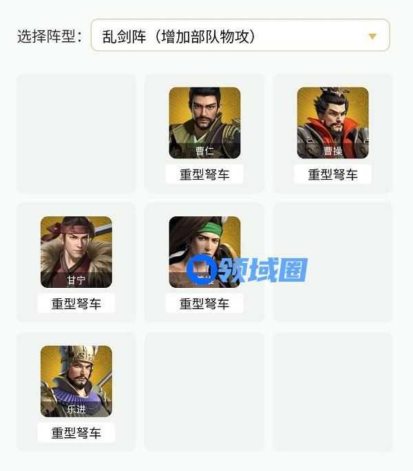 此阵容利用5弓兵兵种,其普攻AOE伤害,可在第一回合就压制敌方血线,限制其输出。阵型我们选择增加武将物理攻击的乱剑阵,进一步强化普攻伤害,领略弓兵兵种带来的极致物攻体验。
