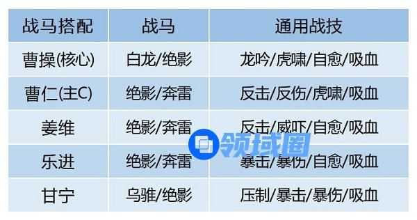 由于该阵容比较缺乏士气,所以战马技能反击很重要,可提高反击概率,增加出手机会,自愈和吸血提升武将续航。
