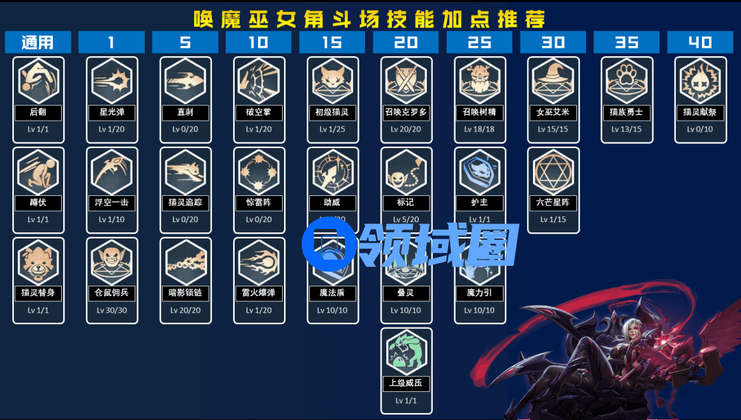 点评:唤魔巫女这套技能和加点,前期靠浮空一击、暗影锁链猥琐风筝苟CD,等女巫艾米和猫族勇士召唤出来后,一套便能将对手带走。