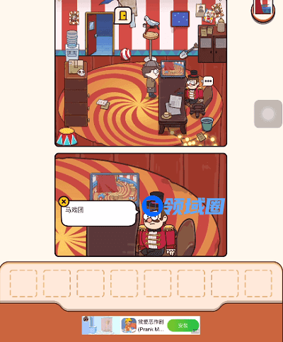 3、在帐篷的杂物里找到另一根弹簧,一起安在左边的蓝色星星蹦床上,用蹦床把自己弹到帐篷里,拉开红色幕布,用炸弹把自己炸回房间,点击马戏团长得到弹弓。