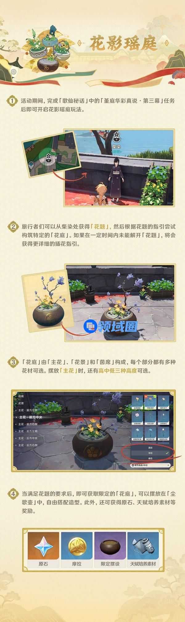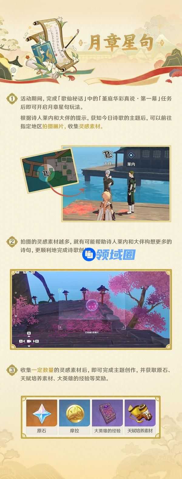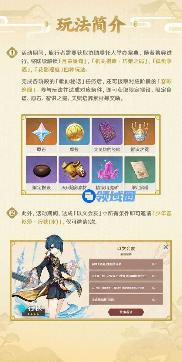 完成神里绫人传说任务:神守柏之章·第一幕「梧桐一叶落」、雷电将军传说任务:天下人之章·第二幕「须臾百梦」、珊瑚宫心海传说任务:眠龙之章·第一幕「兵戈梦去,春草如茵」后参与活动体验更佳。
