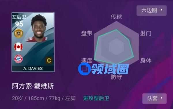 边锋出道的阿方索•戴维斯有着恐怖的速度和爆发力,回追防守让人放心,边路突破颇具威胁。99的双速加上出色的防守数据让他成功占据一个首发。93的体力值也足以说明他有着可以飞奔全场的能力。作为边锋出身的他,传球、射门的卡面数据虽然不佳,但有急坠射门和精确传中的加持就让他的这两项数据变得比较强大。自带精确传中技能也让阿芳在边路有着一脚传中的威胁,新出的时刻阿芳强度更是直接拉满。
