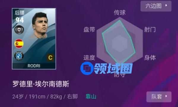 作为后腰球员,我们最需要的就是防守能力,以及攻防转换的能力。看到罗德里的数据,首先他拥有着很优秀的身体模型,191cm的身高和82kg的体重在这个位置可谓是十分难得的。并且罗德里的地面传球和空中传球分别为95和92,在后腰位置已经成为佼佼者。94的体力以及91的抢断更是能让罗德里能全场保持高效率的防守,状态持续性6也能保证稳定的出场。自带技巧单触传球,盯人,拦截,是你后防线上最稳固的靠山!同样,在这里也是更推荐大家使用上一版本的埃尔南德斯,毕竟姜还是老的辣嘛。