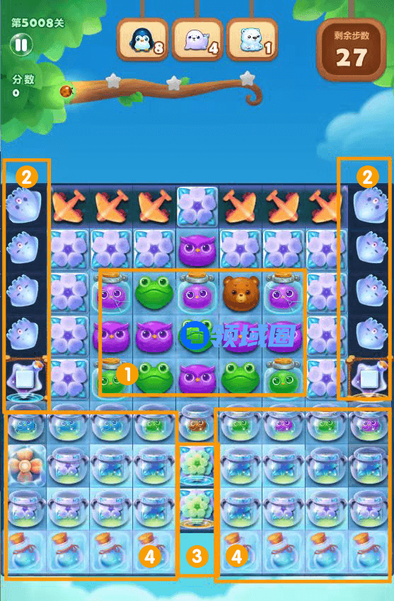 开心消消乐第5008关难点在于激活两侧小鱿消耗步数多,左右很难同时兼顾会出现左边无法动弹+右侧寸步难行的情况,下方障碍多,雪块厚,容易烂尾,那么开心消消乐第5008关怎么过?游戏宝小编为您带来开心消消乐第5008关过关攻略。