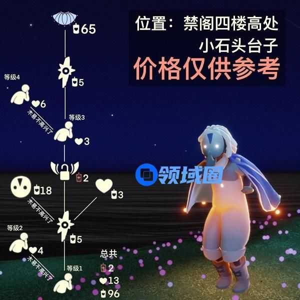 1、嘘声动作先祖兑换图如上图所示,大家可以很直观的看到额饰黑纹的三角额纹面具、荧黄微光缀边的幽蓝斗篷、以及嘘声提醒的噤声动作兑换所需的爱心和蜡烛数量,总共需要2根红蜡烛、13颗爱心、96根白蜡烛。