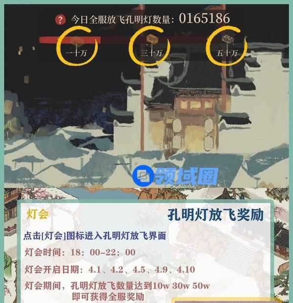 一、灯会每日刷新每日孔明灯放飞次数达十万、三十万、五十万均有奖励