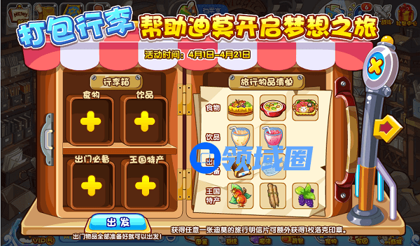 迪莫队长出去旅行,需要小洛克们准备好食物、饮品、出门必备品、王国特产。玩法类似《旅行青蛙》,所有行李准备完毕,迪莫队长就会出发,旅行10分钟,结束后会带回来丰一些小礼品!(搭配物品越贵奖励越好)