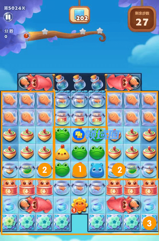 1、第一步:击打陀螺助力消除小鱼干,同时赶走上方墨鱼仔,收集并点亮上方魔法罐。