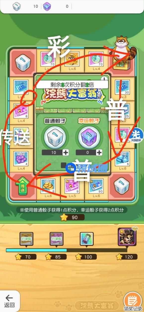 2、第二步:走到双倍后用两次普通筛子,如果恰好走到左下角传送(没走到这次就算了,等下次再达成初始条件),就传送到离右上双倍差六步以内的任意格子,可以根据大满贯差那里自己选。