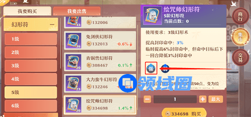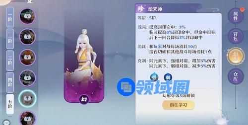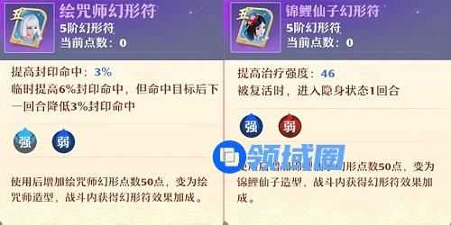 4、五阶幻形符绘咒师和锦鲤仙子,绘咒师适合搭配长生或是合欢使用,可以临时提高封系的命中效果;锦鲤仙子则是南疆和天音的首选,不仅可以提高治疗强度,而且在自身复活后隐身一个回合,大大的提高了辅助门派的生存空间,无论是三输出队还是双奶队,都值得使用。