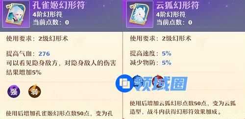 3、除了元素属性的加入,本次幻形符玩法的升级还加入了6张全新的幻形符。四阶幻形符孔雀姬和云狐,其中孔雀姬可以帮助玩家看见隐身单位,并且增加对隐身单位的伤害,可以配合输出职业用来对付隐攻宝宝;云狐则是提高5%的速度,减少5%的物防,可以搭配合欢等高速门派使用,但抢一速的同时需要注意生存空间。