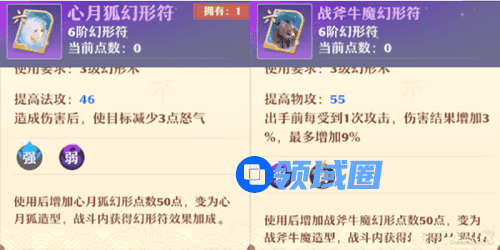 5、六阶幻形符心月狐和战斧牛魔,心月狐在提高法攻的同时可以减少目标的怒气,与法系输出门派简直是绝配,再也不用担心自己的AOE伤害会给对面送怒气了;战斧牛魔则是物理输出门派的福音,该幻形符在提高物攻的同时,还能够百分比提高伤害结果,最高可达到9%,非常适合用来点杀敌人。