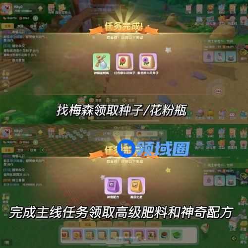 1、首先先去做主线任务,找梅森领取种子/花粉瓶,一步步完成主线任务领取高级肥料/神奇配方。