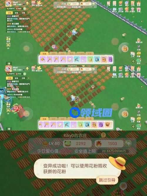 2、种植—使用高级肥料快速成长—植物头顶上出现花粉瓶—点击农具(花粉瓶)获取花粉—再点击(花粉)使用不同颜色的花粉授粉—高级肥料快速成长—植物成熟(变异成功)