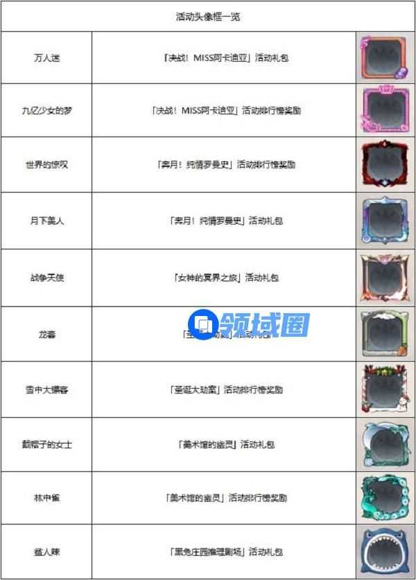 注1.活动排行榜获得的头像框均为绝版头像框,备忘录活动(复刻活动)中无法获取。