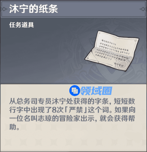 找到了专员沐宁,可他却向我们要七星的许可,还答非所问地给我们讲了一堆注意事项,最后还建议我们去找受雇于总务司的冒险家「志琼」聊一聊,并给了我们一张凭条作为凭证。