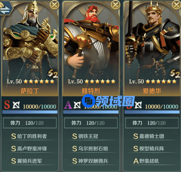 4.主将是萨拉丁-雅法突袭自带高连击,能多次触发高卢野蛮冲锋和翼骑兵进军两个高额伤害的突击技能;副将腓特烈带乌尔班射石炮为主将加力量,大幅提高其输出;爱德华则搭配楔型骑兵阵和野蛮战吼进一步加强主将输出。