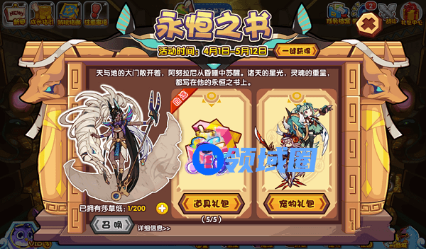 点击即可打开界面,这一次阿努拉尼的活动也将提供两种获得方式。第一种是通过集齐阿努拉尼的莎草纸进行召唤获得,该方式仅可获得1次。另一种是通过一键获得,一键获得不限次数,但是需要满足不同条件。