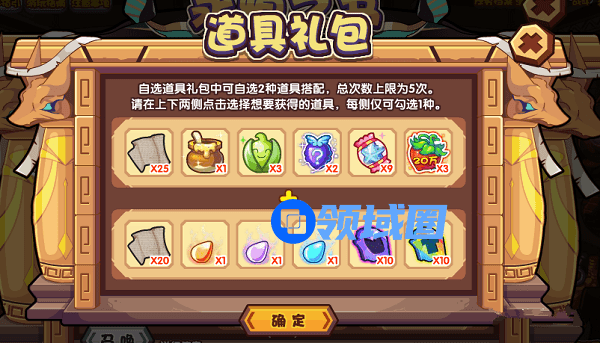 《永恒之书》活动中礼包分为两种,一种是道具自选礼包,一种是宠物礼包。点击【道具礼包】按钮进入自选道具界面。自选道具礼包中我们可以选择2种道具搭配,礼包的总获得次数上限为5次。需要在上下两侧各点击选择想要的道具,每侧仅可勾选1种。
