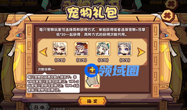 宠物礼包的可选择内容就更多了,点击【宠物礼包】按钮进入宠物选择界面。每只宠物有两种方式获得。我们可以单独选择宠物,或者选择宠物+莎草纸*20的方式一起获得。每只宠物可获得的次数上限,根据vip等级不同而变化。非vip用户每只宠物可获得1次;vip1-3用户每只宠物可获得2次,vip4-5用户每只宠物可获得3次。单独获得宠物或和莎草纸一起获得宠物,这两种方式的获得次数共用。