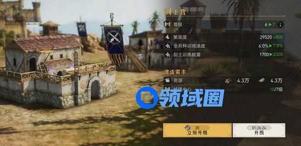 士兵是开疆扩土的核心基础,兵营的提升能加快士兵的训练数量、训练速度。配合时代,兵营在达到5、10、15三个等级时,还会产生质变。