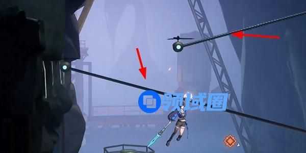 4、接着会看到索道,然后需滑下去并过一个机关,来到下图位置后需进行交互,交互后需继续向前走并下去;