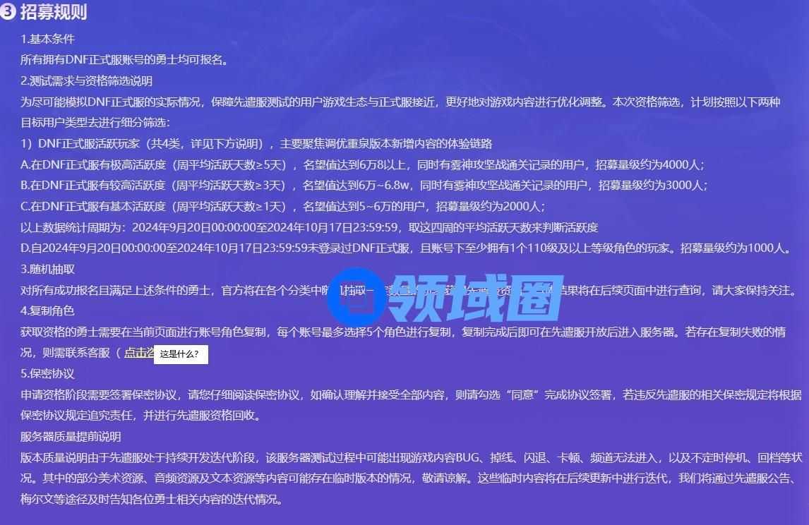 自2024年9月20日00:00:00至2024年10月17日23:59:59未登录过DNF正式服,且账号下至少拥有1个110级及以上等级角色的玩家,招募量级约为1000人。