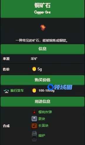 铜矿石可以放在熔炉中冶炼制作出铜锭。冶炼消耗5个铜矿石和1个煤炭,耗时30分钟(游戏内时间)。售价为60g。