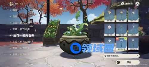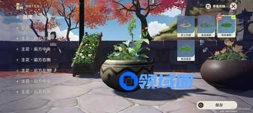 10、其中上面标号4、6、9都选第三行第二个花材,标号5、8选第三行第一个花材,7选第三行第三个花材,上面的花材选取步骤都选完后点保存即可完成盆景摆放任务。
