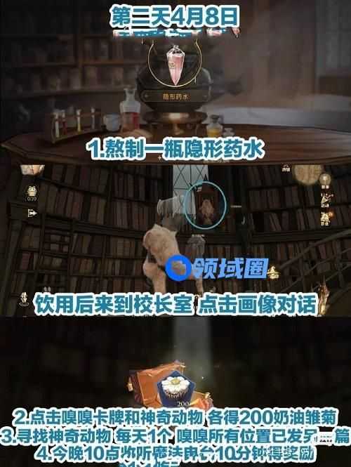1、饮用隐身药水进入校长室对话画像&点击嗅嗅卡牌和神奇生物嗅嗅共400。