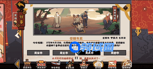 1.玩家们在四个选项中选则北周武帝宇文邕(yong,一声)即为正确答案。