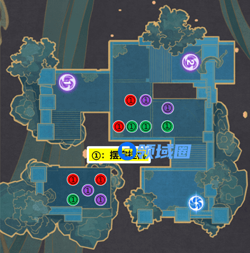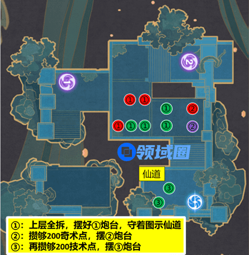 3、上层全拆,摆好①的炮台,守着图示先到。