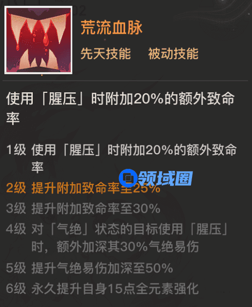 4、小白的作用与土也和拔拔不同,小白最大的左右就是他的被动技能,荒流血脉:使用“腥压”的时候,附加20%的二外致命率,且升级到四级的时候,还会对气绝状态的目标额外加深其30%气绝易伤,升到五级的时候额外的气绝易伤还会提升至50%,携带小白至少要把小白的被动技能升星带5星,小白适合输出携带。
