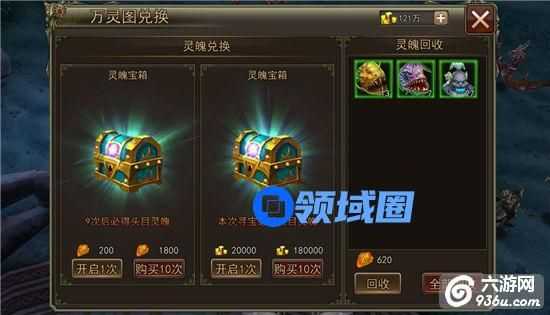 获得的多余灵魂碎片,可以在‘灵魂兑换’界面进行回收。同时,这里还能够使用回收币或者游戏内金币抽取更多的灵魂碎片;