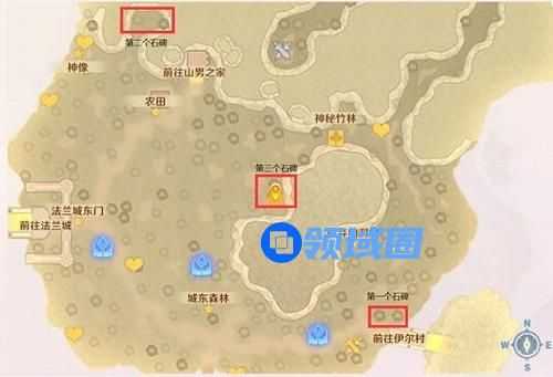 4、法兰城东郊的石碑按照上图的坐标去寻找就可以找到了,一共三个石碑,希望可以帮到玩家们。
