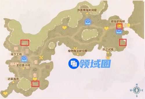 5、按照这四个坐标的位置就可以找到圣拉鲁卡村的四个石碑了,不知道在哪的玩家参考上图四个红框就行。