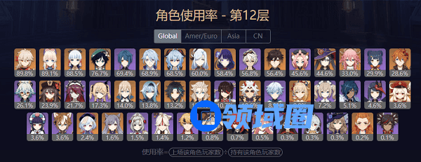 该数据基于全球1W名以上深渊12层通关的玩家统计而来,使用率的算法为在12层使用该角色玩家总数÷持有该角色玩家总数,使用率越高,代表持有该角色的玩家更愿意用这个角色去打深渊。