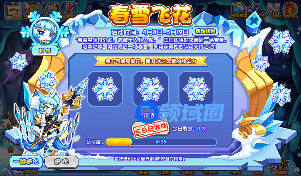 3、活动攻略:使用魔法石和灵石可点亮雪花,点亮雪花越多,挑战难度越大,但成功获得的进度越多,初级挑战成功可获得1点进度,中级挑战胜利可获得2点进度,高级可获得3点进度。