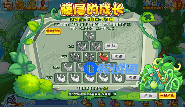 3、活动攻略:通天塔系列藤蔓巨龙回归了!与BOSS挑战可激活籐尾,两个下一层相邻的籐尾可合成上一层籐尾,只有合成出上一层籐尾才能挑战上一层,激活出绿色籐尾即可获得藤蔓巨龙的进化资格